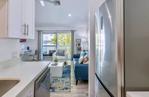The fully-outfitted kitchen sits off the living area with luxury appliances and tools, equipped with everything you'll need to prepare a meal at home in between enjoying the fantastic array of Old Town restaurant options, all just a few blocks walk away. Featuring both a drip coffee maker and a Keurig, not to mention Cuban Coffee Queen is right downstairs, all of your coffee needs will be well taken care of.