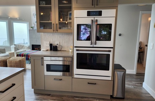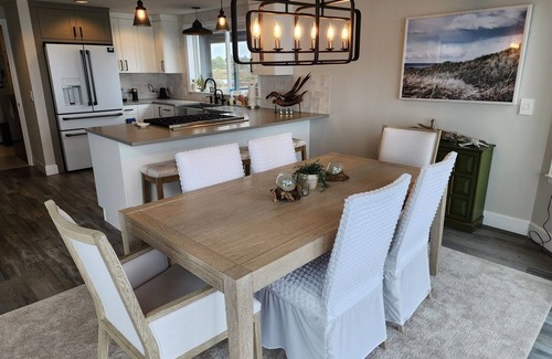 As you enter the main living space on the first level, you will be greeted with floor to ceiling windows that allow an abundance of light and incomparable water views. The open concept living/dining area with double story high ceilings is comfortably equipped with contemporary furnishings. You will enjoy relaxing ambiance of the gas fireplace to wind down from a busy day. The fully equipped gourmet kitchen is complete with aWolfrange,Caf appliances, and all the tools you need for an easy snack or a culinary challenge. Need coffee or tea to start your day off right? The kitchen is equipped with aNespresso machine, drip coffee maker, French press, OXO coffee grinder, andFellow tea kettle.
