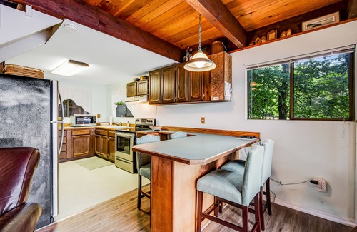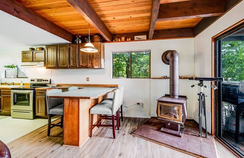 Inside, you'll find a casual kitchen with full-size appliances and a two-sided breakfast bar with seating for four. There's a gas grill on the deck to assist with meal preparation, a washer/dryer to refresh the day's damp clothes as you eat, and a wood-burning stove to warm you as you read or play games in the living room. There's also a Netflix-equipped flatscreen TV upstairs in the loft for movie nights.