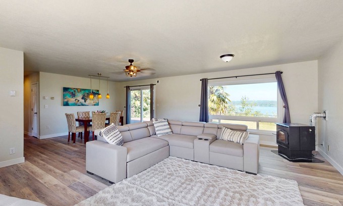 Welcome to your waterfront retreat. Inside this home find a relaxing living room complete with a sectional and flatscreen TV - not to mention breathtaking views of the Sound. When the group gets hungry, head into the well-appointed kitchen sparkling with stainless steel appliances. Dine together at the table for six. Outside, enjoy the view from the spacious deck. The flat, enclosed backyard on the high bank only enhances the eastern view of the water. At night, rest your head in one of two bedrooms. The primary bedroom features an ensuite bathroom that includes a standalone shower and tranquil bathtub. The office, which is available for guest use, houses a futon as an additional sleeping option.
