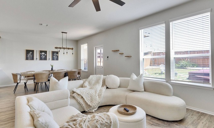 This bright and stylish 4-bedroom, 2.5-bath boho-chic home in South Austin offers a relaxing retreat with a fresh, airy feel from its renovations, which emphasize natural textures and a laid-back bohemian style throughout. The thoughtfully decorated space is designed for comfort and fun, featuring a luxurious soaking tub in the primary suite and an open-concept living area. Its prime location is approximately a 10-15 minute drive from popular downtown Austin attractions and about 5 minutes from the charming city of Buda. Guests can enjoy a private backyard with a jacuzzi spa and grill, or take advantage of the community pool, lazy river, and playground. An EV charger is also available for guests.