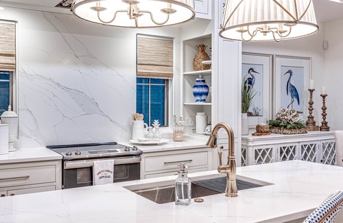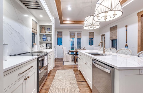 The front door welcomes you into the screened porch area with comfy chairs, an adorable bed swing and ceiling fan for your comfort. Continue inside to find our favorite place to hang with family and friends. The open concept floor plan features the beautiful well appointed kitchen, open dining area, large designer living area, a half bath, mud room space and utility space.