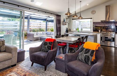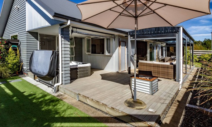 Open up the ranch sliders to create seamless indoor-outdoor flow on to the deck, sheltered by a fantastic Archgola and offering two alfresco living spaces. Prepare delicious meals in your fully equipped kitchen and enjoy eating them together as you laugh about the day’s adventures. Later, pop the dishes in the dishwasher and indulge in a long hot soak in the spa pool!