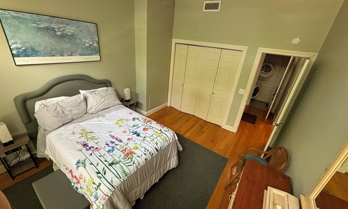 With high ceilings, the airy space features a comfortable queen bed. Amenities include a full-sized in-unit washing machine and dryer, and all dishes, pots and pans, a dishwasher, and cable and WiFi. Co-working space and lounge in the building