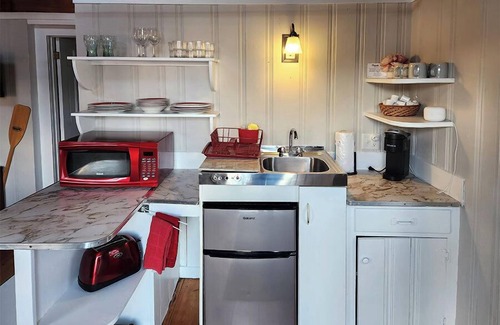 The open kitchen area has a stove top, a medium size refrigerator & freezer, and all the necessary kitchenware like pots & pans, dishware, glassware, toaster, microwave, Keurig coffee maker (individual k-cups) and more...