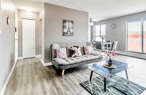 This warm and cozy Hamilton two bedroom apartment offers all the amenities you'll need during a quick getaway - a perfect space for a group of friends or small families! Enjoy preparing your dinner in your fully equipped kitchen with high-end appliances, dining al fresco on the private balcony in the warmer months, or getting toasty and warm inside while watching Netflix. The space also features comfortable beds, an open concept living area with high ceilings, complimentary coffee and tea, and high speed wireless internet. There's room for six guests with the sofa bed in the living room.