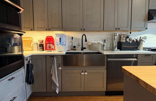 The kitchen is equipped with stainless steel appliances, various tools, and large island. The living room has a pool table, couch that fits the whole family, and books/toys for the kids (and adults!). There is a large bedroom facing the street with plants, natural light, exposed brick, fireplace, and an original ornate lighting fixture. There is also a desk with monitor and a large wall mounted TV.