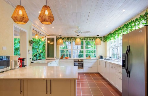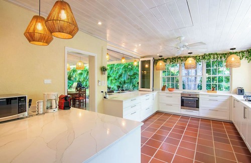 The outdoor area is spacious and cool with ceiling fans and island breeze. The kitchen leads out to the back patio dining area and adds a tranquil space for enjoying a leisurely meal. Enjoy the plunge pool and 6 loungers after a day on the beach or read a book on one of the seating areas on the covered verandah.