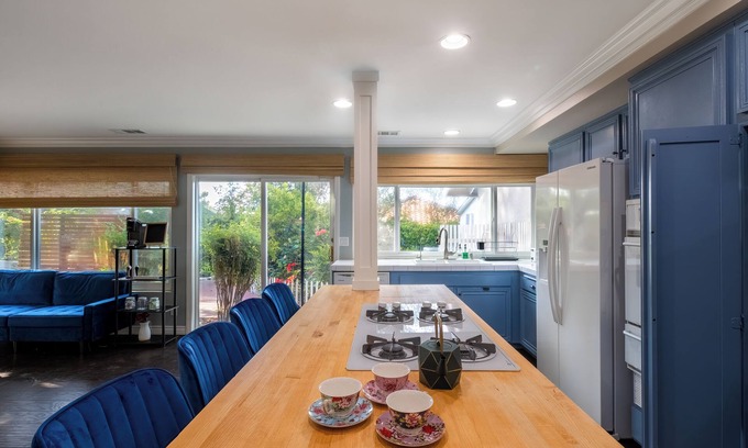 Your luxury getaway will start in our quiet neighborhood; on top of a hill; overlooking the Golf Course-in Riverside. You will have an exclusive 3 bedroom 2 bathroom house. It is fully equipped with kitchen appliances, 2 living rooms, 4 smart TVs, a private workspace in every room, a pullout couch for additional sleeping arrangements, full arcade, in unit washer dryer, gym, pet corner and large backyard!