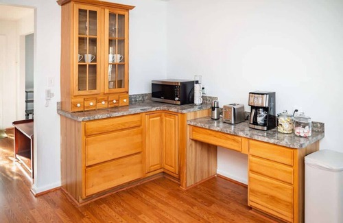 The fully equipped kitchen features stainless steel appliances, a 4-burner electric stove, and all the essentials. Enjoy meals together at the elegant dining table, which seats 8, or take breakfast to the sunny patio.