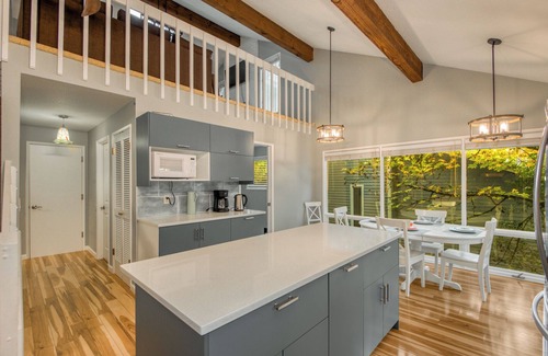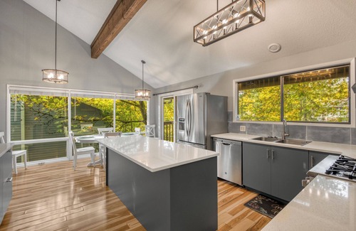 Welcome to our recently (November 2023) remodeled 6 bedroom/3.5 bathrooms house with a lot of space to play and relax in the house or at the backyard next to the creek. We have the fully equipped kitchen, the grill and the big dining table which can accommodate at least 14 people. There are three bedrooms on the main floor, easy to access, and other three bedrooms and the playing area are downstairs. The living area is next to the dining where we have TV and sofa bed. There are two decks, one accessible from the kitchen, another from master bedroom. The loft with TV and extra sofa-bed is above the kitchen. Please find the pictures which include the detailed floorplan and some furniture description.