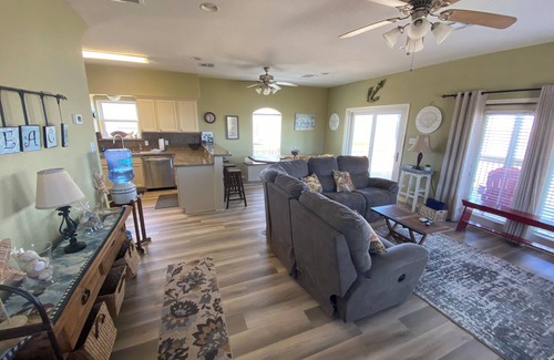 We just completed new decks, painting, granite countertops in the kitchen and flooring throughout the home. This home has two very large covered balconies facing Little Drum Bay. Watch the kids fish on the lighted pier while you relax on one of the new decks that look out over the bay. This is also a great place for everyone to crab and then have a crab boil. We always bring extra shrimp, potatoes and corn just in case. This is also an excellent place for Kayakers to come to stay and fish. Easy launching beside the home. Read your favorite book, nap or sip on your favorite drink while watching the spectacular sunsets.