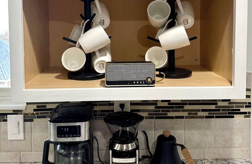 In the kitchen you will find a coffee bar with a complimentary box of small batch craft coffee beans. Brew your beans with a drip coffee machine or pour over. Use the grinder for fresh ground coffee daily! For tea lovers you will find a selection of fine teas, a modern hot water kettle and milk frother for all your London Fog or Latte needs.