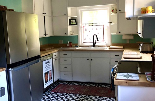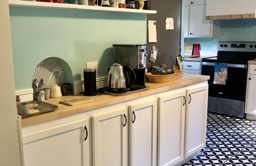 The House@63 has four bedrooms all updated with new mattresses and pillows, high thread count cotton sheets, cozy comforters, and cotton quilts. There are plentiful hooks, mirrors, storage, and hangers for each room. Two bedrooms are on the main level, one with a king bed and one with a queen bed. Two more bedrooms are upstairs, one with a king bed and one with two twin beds. There is ample space in the upstairs king bedroom for a (provided) queen air mattress if more sleeping space is needed. There is a third twin bed on the sunny upstairs landing perfect for lounging, reading, and cat naps. The twin bedroom has blackout shades.