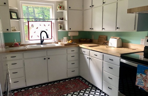 The House@63 features a midcentury era vintage-looking but fully modern and well-equipped kitchen including an air fryer, toaster, microwave, coffee bar, RO water filtration system, and stainless appliances. We provide the basics like oil, s & p, and sugar, along with a well-stocked spice cabinet. Outside there are two grills for your enjoyment, one gas and one charcoal. You can grill up some of the bountiful local offerings available at the farm stands and grocers.