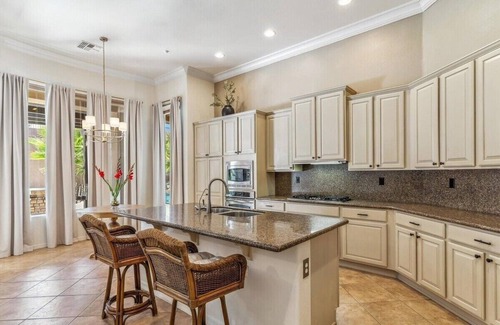 Enjoy this beautiful, newly furnished home in the Anthem Country Club! Situated on a huge private lot in a serene, gated community, this luxury home offers a marvelous retreat for guests. The resort-style backyard backs up to a desert wash with no neighbors behind you, and features a putting green, heated pool with waterfall, hot tub, BBQ kitchen island, and an elevated patio with a gas fireplace, covered by an expansive Alumawood Pergola. The beautiful single-level home sleeps up to 12 people. It has brand new, high-end furniture, furnishings and décor, and is fully stocked with everything needed for your stay.