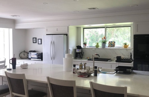 The well appointed kitchen features gas cooktop with double ovens, dishwasher, air fryer, stand mixer, toaster oven, microwave, coffee maker, coffee grinder and blender for all of your cooking adventures. A full set of pots and pans, along with baking dishes are included. The refrigerator and pantry contain the basics to get you started on masterpiece meals! Plenty of spices, olive oil, ketchup, mustard, sugar and flour are included. Coffee and tea are there to get you started in the morning. The kitchen area seats 10 people and the adjoining dining room seats eight comfortably.