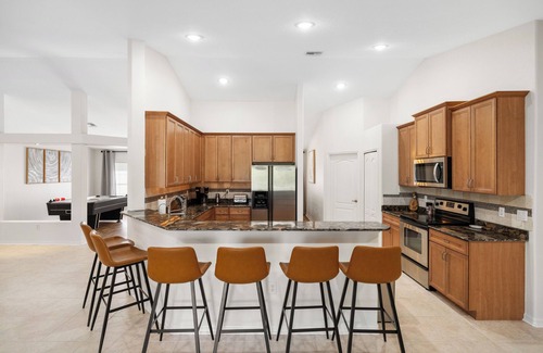 The fully-equipped kitchen is a culinary haven, boasting modern appliances, granite countertops, and an island with barstool seating. Whether you're whipping up a gourmet meal or brewing your morning coffee, this kitchen has: pots and pans, toaster, blender, coffee machine, kettle, all tableware, silverware, cookware, drinkware etc.