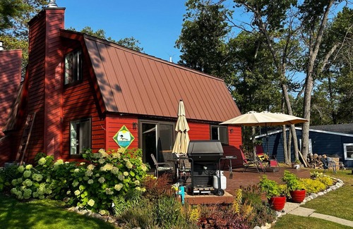 Welcome to our charming barn motif lakefront home located on beautiful Big Bear all sports lake located East of Gaylord. Make memories sipping coffee on the deck or dock overlooking the lake at sunrise, kayaking from your own sandy beach, stargazing around a campfire and exploring all that northern Michigan has to offer. Enjoy hiking, biking, snowmobiling and ORV trails. Use our kayaks and small fishing boat with electric trolling motor. If you choose to bring your own boat, a DNR access point is conveniently located a quarter mile away. This lakefront home sleeps 7 guests comfortably with 4 beds/4 bedrooms. One bedroom is located on the ground floor with the remaining 3 bedrooms on the upper level. If needed an extra inflatable queen size mattress is available. Bed linens and towels are provided. Our home has one full bathroom on each level. The upper bathroom has a Jetted tub. The kitchen is fully equipped with everything you need to prepare delicious meals including a range, oven, microwave, dishwasher and refrigerator. All the cookware, dishes and utensils needed are provided as well as a coffee maker, toaster and crock pot. Guests can also enjoy the grill and fire pit outside. Outdoor furniture is provided. Amenities include: high speed WIFI, 65" Smart TV in the living room and 2 bedroom TVs, AC, fireplace, washer and dryer.