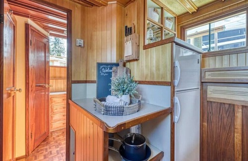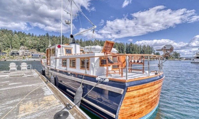 Floating cozy and charming "Blue Goose" is located in the heart of Gig Harbor where all of the historic sites and restaurants are within a short walking distance. Rare boat at a rare historic net shed and dock. Use the provided kayaks to paddle around lovely Gig Harbor--or paddle to the Tides Tavern or Anthony's seafood for lunch! Complete with two en suite staterooms, a cozy living room, and a view of sunsets and Mount Rainier! Sit on the upper deck for coffee/cocktails, bbq, watch activity.
