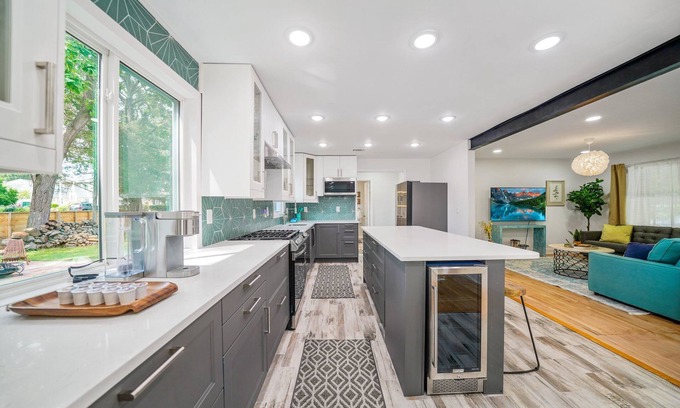 The heart of the home is our modern kitchen, equipped with a large island and new appliances. It seamlessly opens into the dining area, making meal prep and dining a delightful experience.