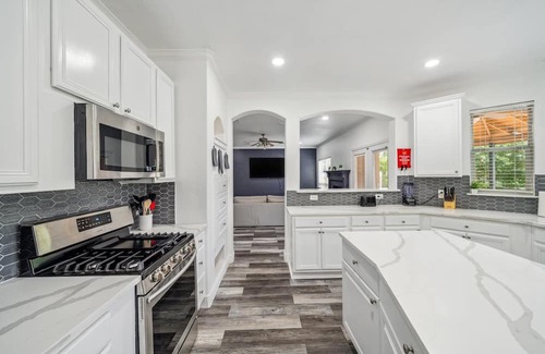 Fully equipped kitchen with high-end appliances: gas stove, oven, microwave, refrigerator, dishwasher, and Keurig coffee machine.