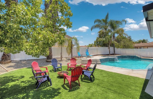 Relaxing vacation vibes in this spacious tropical modern 5 bedroom home with a pool, jacuzzi, game room, and fire pit. Very close to UC Riverside, NOS center, and Yamava Resort & Casino! This home is 3000+sqft within walking distance to shopping and restaurants.
