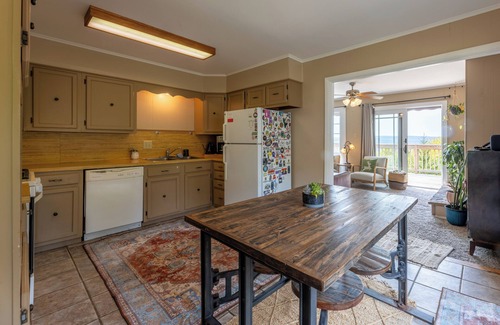Kitchen: Well-stocked with basic spices, a coffee pot, toaster oven, waffle maker, teapot, bakeware, cookware, Crockpot, and a toaster. There is a Kureig coffee maker on the lower level with coffee and hot chocolate pods. The dining table seats 4 and there are folding tables and chairs that can be set up inside or outside. Additionally there is more seating on the lower level.