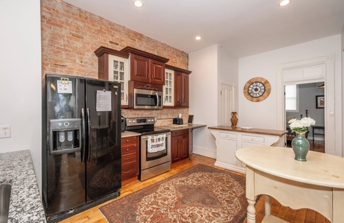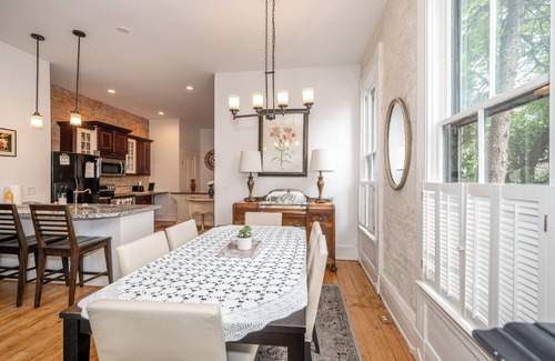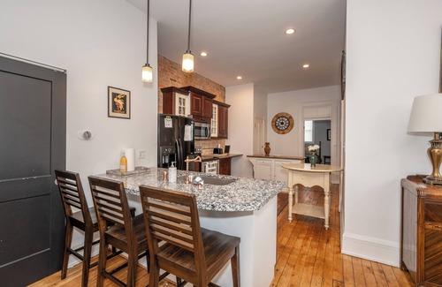 The upper apartment on the second and third floors of this townhome has more of a bohemian and fun furnishing style. The roomy kitchen is fully equipped to make meals at home, which you can enjoy at the large bar or at the breakfast nook overlooking the quiet alley. Upstairs on the third floor of the home, you'll see out the north facing windows a peek of the top of Cincinnati's skyline- particularly the Great American building and our city's