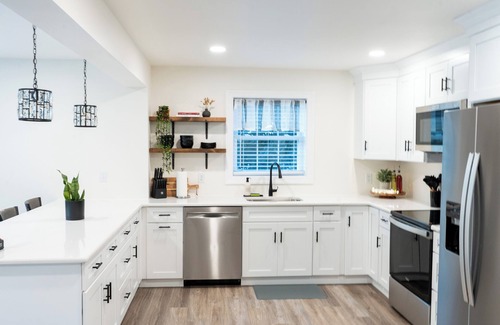 The bright and airy kitchen consists of a coffee bar, brand new appliances, large table and island that provide a great place to play card games when you are not using the space for dining. It is fully stocked with spices, olive oil, Kcups, Sisel instant coffee and more. On the first floor there are 2 bedrooms, 1 King bed and 1 Queen bed. And a spacious bathroom with a shower and a deep tub where you can soak away the weariness from a day of activities.