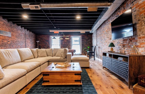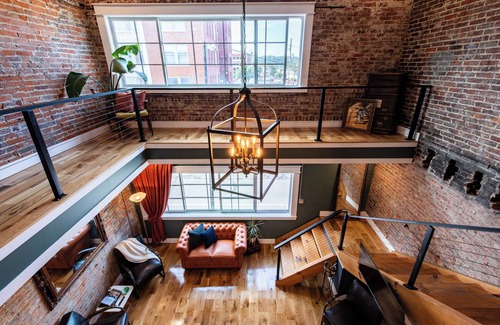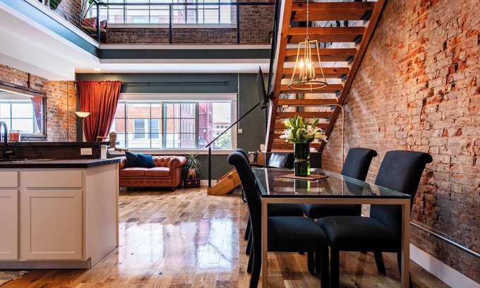 Quaint, historic, downtown New Albany is waiting for your group in this 5-bedroom building. This 2 story loft (second and third floors) was formerly a part of the New Albany Opera house. It has 1 king primary, 2 queens rooms, two twin beds, and 2 sets of bunk beds (for total of 9 separate beds amongst five bedrooms) and is perfect for your large group of guests. This location is within walking distance to MANY local restaurants and shops with plenty of parking at your door step. The historic Wine House loft sits above the Wine Shop, a boutique restaurant and shop that will also deliver upstairs. Your group will enjoy multiple living spaces plus a large hang out room with pool table and bar.