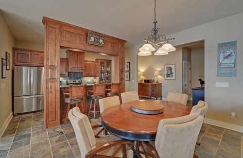 Unwind in this mountain-lake lodge featuring a spacious interior with two indoor fireplaces, stunning lake views, firepit seating for twelve and private boat dock.