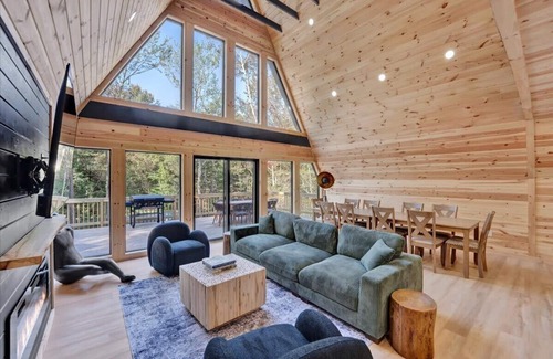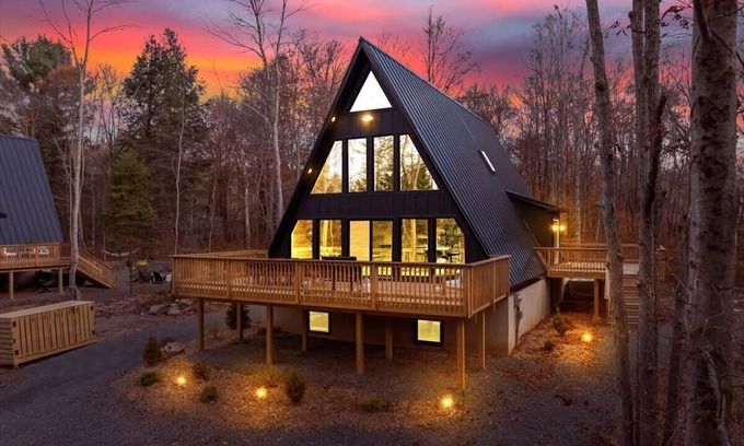 Welcome to the Hygge A-Frame, your spacious sanctuary in the Pocono Mountains! This expansive three story 3,100sf retreat comfortably accommodates up to 16 guests, making it perfect for family gatherings or fun getaways with friends.