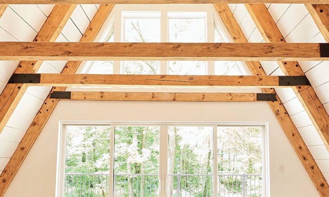 The A-frame living room is a highlight, with its high ceiling and exposed beams creating a special space where you’ll love to spend time with friends or simply relax with a good book. While we don’t allow indoor fires, you can still set a warm and cozy ambiance with the remote-controlled candles we’ve provided in the wood stove.