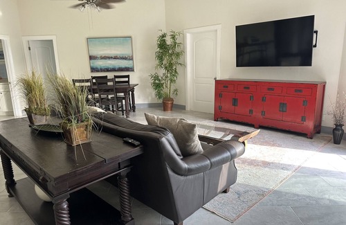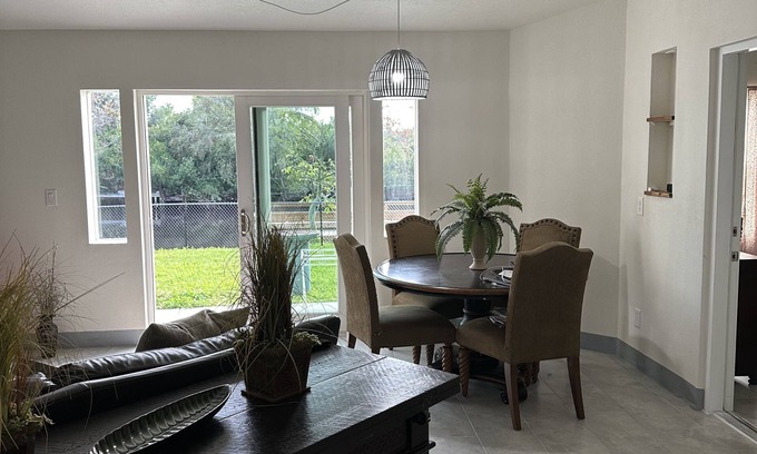 Stay comfortably in Fort Myers at this 5-bedroom house. With 5 king beds, this wonderful property offers ample space for guests to relax and unwind. The house features a fully equipped kitchen, a cozy living area, and a private office with a sofa bed. Enjoy the convenience of amenities like a washing machine, WiFi, AC, and heating. The 3 bathrooms are equipped with showers for your comfort. Surrounded by beautiful scenery, this phenomenal vacation rental is a great place to call homebase while you're away. We hope you enjoy your stay. Daily or Weekly rentals, rent the whole house or just a room if you like. Two of the Bedrooms and Office have Private Entrances. Just 10 minutes from The City of the Palms downtown Fort Myers, Restaurants, shopping and Fun in the Sun. Relax and fish or boat off the dock. Enjoy the Manatees in the cove in your backyard.