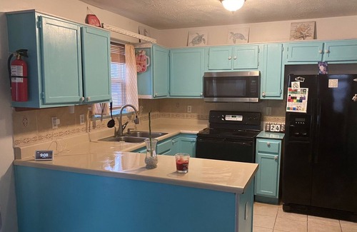 You like a rental with lots of space you got it! There is a living room with a fireplace, a dining room, a Florida room and a fenced backyard. 3 rooms have regular beds.