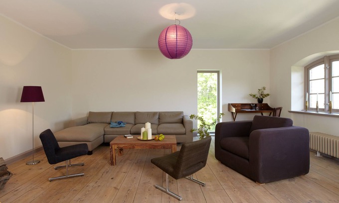 The apartment Amsee is our smallest apartment in the manor house. It is on the first floor to the rear, floor-length window slots offer a beautiful view of the (usually) lush garden-green. The living and dining room is with a size of 60 square meters as in each apartment very generous. The kitchen is well equipped and is suitable for cooking and cooking together, at the dining table fit more than four people.
