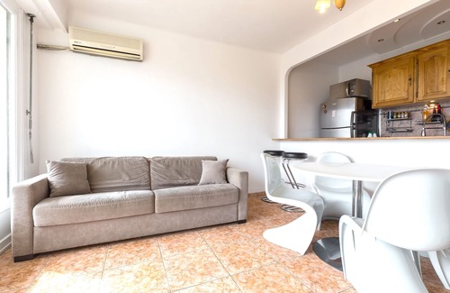 Located in Antibes Juan Les Pins, your apartment, 3 rooms, is very close walking to the sandy beach of Juan-les-Pins. Bright, with its 7 beds, it is in the quiet place of a very pleasant residence. Air-conditioned, this apartment is ideal for groups of friends or families, for a holiday in the Mediterranean sea. Close to all shops and transport (bus trains).