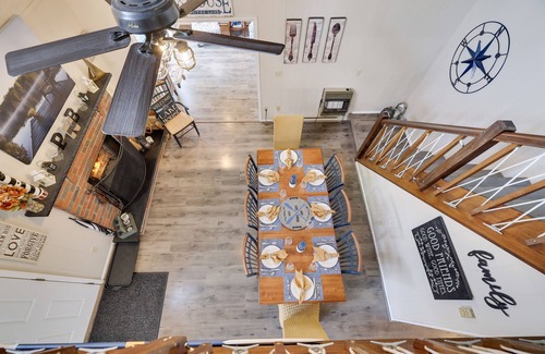 Upstairs on the upper level, you will find a large bedroom, bathroom, and loft area for an additional sleeping option or an area to read or play board games.