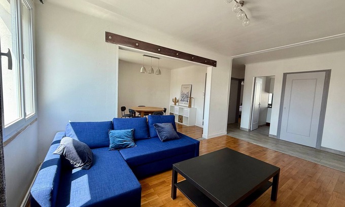 Located in the town center of St Jean de Monts, 5 minutes from the long, sandy beach and the forest, on the 1st floor (without elevator), this very spacious apartment offers a beautiful, bright living room (double sofa bed 140cm), a fully equipped kitchen, two bedrooms with a double bed (140cm x 190cm), one bedroom with two single beds (90cm x 190cm), a bathroom, and a separate toilet. Pets are not allowed.