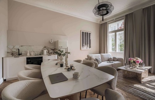 Each of our apartments has been designed with comfort and aesthetics in mind. Carefully selected details, elegant finishes, and modern amenities ensure a pleasant stay — whether you are visiting for a short weekend getaway or a longer trip. The interior design perfectly complements the historic character of the building — original architectural elements such as high ceilings, decorative mouldings, and stylish interior details allow guests to experience the unique atmosphere of pre-war Warsaw.
