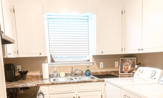 Spacious, 2 bed/1 bath apartment with private entrance and covered parking. King bed in bedroom and pull-out Queen bed in Living Room couch. Includes full size washer/dryer and fully functioning kitchen. Large walk in closet, great for extended stays. Centrally located near shopping, food, and downtown. Just a short 7.6 mile drive from Wind Creek Casino, additional dining options, and I-65 interstate access. DISCLAIMER: we have two dogs (a golden retriever and a border collie mix) on the property that utilize the fenced in backyard throughout the day. They are both friendly, but remain in the fenced in yard so that they do not bother guests. Guests have a separate back yard area that the dogs cannot access. We just want future guests to be aware that the dogs are on the property.