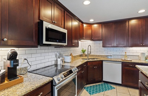 There is one flight of stairs to reach the main level, which includes a gourmet kitchen, living and dining area, two bedrooms, and two full baths.