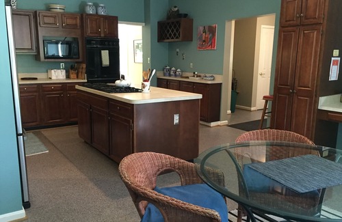 The house is wonderful; all the rooms are very large, with hardwood floors, high ceilings and lots of light. The huge kitchen with island and open breakfast room is easily the center of the home. Everyone loves to gather here. Right off the kitchen is the family room with French doors that take you out to a deck, where you can sit under 200 year old oak trees. This room has the TV, which you can also see from the kitchen. The gracious, separate dining room and inviting living room give everyone a place to spread out or to gather and entertain.
