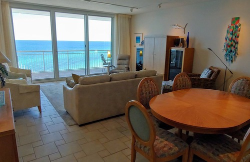 One of the largest 3BR/3BA condos on Navarre Beach. 2 Gulf front bedrooms with floor to ceiling glass for unobstructed views across the Gulf and down Santa Rosa Island. Access the private Gulf front balcony from the great room and two bedrooms. From the balcony you will see breath-taking sunrises and sunsets over the Gulf throughout the winter season, sunsets over the Santa Rosa Sound in summer, and rolling dolphin all year round. The third bedroom has a nice Sound view.