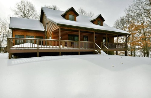 Four bedroom getaway centered on 12 acres for ultimate privacy and wildlife. This is your spot for a group who wants the lake life, but also privacy. Look out the 30 windows and see views of the lake/dock, navigable creek that flows into two other lakes, hearty oaks/poplars, or the family enjoying a fire and smores. Your cabin comes equipped with a canoe, kayak, paddle board, splash pad, outdoor games, indoor games, poker/pool table, 5 smart TVs, and more. Pull out onto the ATV trails.