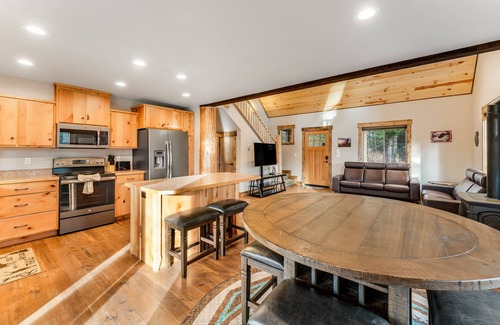 Step inside to find a living space that's bright, open, and beautifully appointed. Cook with ease in the airy kitchen with modern stainless steel appliances, sit down for family dinners and card games in the cozy warmth of the gas fireplace, and choose between smart TVs in the living room and the upstairs loft for your movie nights afterwards. At night, there are two bedrooms on the main floor and a primary suite upstairs offering an attached bathroom and direct access to the deck. Complimentary WiFi and a private washer/dryer are provided as well.