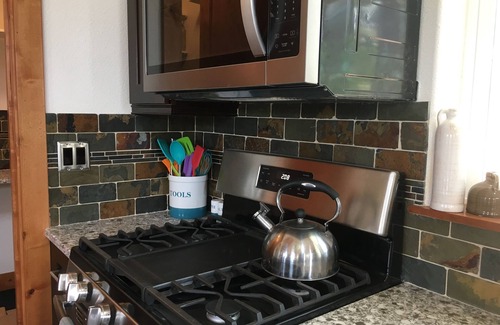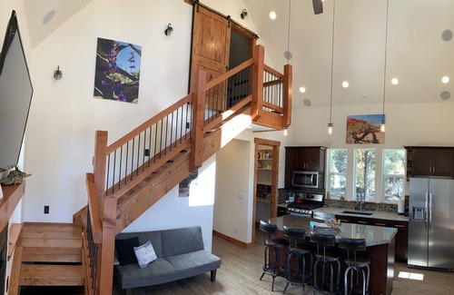 Open floor plan with two bedrooms, loft, & 2 1/2 baths; fully equipped kitchen (bring your own food ;-). Queen bed in master suite, queen bed in downstairs bedroom, two twin beds, one bunk bed, and twin futon in loft; sleeps nine. Washer/dryer, gas fireplace, high speed internet access, blu-ray disc collection with two blu-ray players; 5.1 home theater system & two flatscreen TVs. Sitting areas in great room and upstairs loft. Wrap-around, 600 sq. ft. covered deck overlooks the sunset. Gas grill, gas firepit, & outdoor seating allow you to relax & watch the stars come out with dinner & a glass of wine.