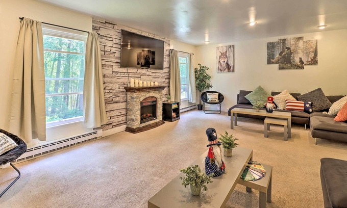 Highlighted by must-have amenities and proximity to outdoor fun, this family-friendly Cresco escape has all the essentials for a memorable stay in the Pocono Mountains! This woodsy vacation rental boasts a quiet location and plenty of space with 5 bedrooms, 4 full bathrooms, and 2 half bathrooms. After a day of adventure and sightseeing, you can unwind with Smart TVs, a game room, and all the comforts of home. Fire up the grill for dinner on the deck, or enjoy a relaxing evening by the fire pit!