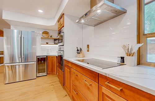 Quiet moments to yourself can be spent in the primary bedroom. Roll back the barn doors and enjoy having access to a walk-in closet and spa-like bathroom with a huge walk-in shower. The home's additional three rooms are just as inviting, all freshly decorated with soft linens, wilderness-themed mementos, and even central air-conditioning. The modern conveniences extend to a private washer/dryer, Pack-N-Play, gas fireplace, and internet access.
